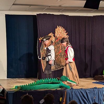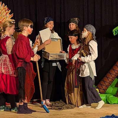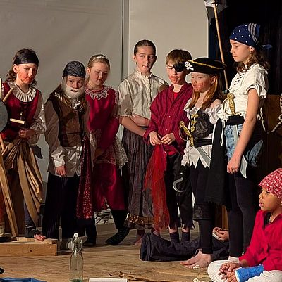 Unter der Leitung von Judith Wolf und Ulrike Hess wurde in den letzten Monaten fleißig gesungen und geschauspielert: Der Chor aus über 50 Schülerinnen und Schüler der 3/4er-Klassen hat hochmotiviert die mitreißenden und pfiffigen Lieder für das Musical „Das geheime Leben der Piraten“ eingeübt. Im Musicalatelier wurde außerdem intensiv mit allen Schauspielerinnen geprobt und das Bühnenbild und Kostüme gefertigt.