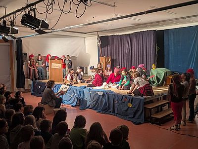 Am 24. und 25.3. wurde das Musical schließlich in der vollbesetzten Aula vor Eltern und interessierten Gästen aufgeführt. Außerdem gab es noch je eine Aufführung für die Mitschülerinnen und Mitschüler und die Kinder der Kooperationskinderhäuser. Viele Kinder wuchsen dabei über sich selber hinaus und die Zuschauer waren begeistert.